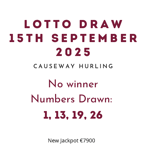 Take part in Causeway GAA lotto by purchasing your tickets on Kellihers Hardware Tralee, Hartys Bar, The Forge Cafe & Hanley’s Shop. You can also enter online in the Clubforce Causeway GAA page(https://clubs.clubforce.com/clubs/gaa-causeway-gaa-kerry/)