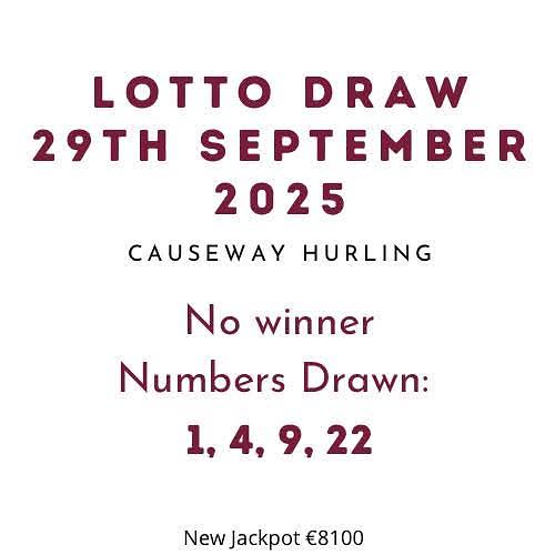 Take part in Causeway GAA lotto by purchasing your tickets on Kellihers Hardware Tralee, Hartys Bar, Keane's Bar, The Forge Cafe & Hanley’s Shop. You can also enter online in the Clubzap Causeway GAA page(https://causewaygaa.clubzap.com/draws)