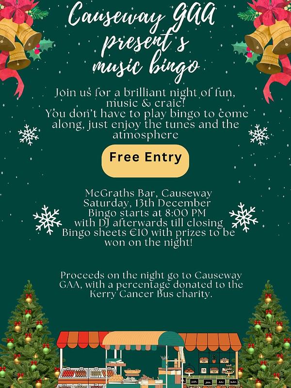 For a fun night out, come along to our Music Bingo night on the 13th of December at McGrath’s Bar. It’s a great way to start the festive season! Don’t miss out—bring your friends and join us for an unforgettable evening filled with music, laughter, and fantastic prizes!